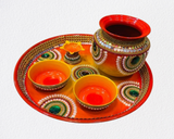 Celebrate your sacred rituals with this traditional Steel Puja Thali Set, designed for occasions like Diwali Pooja and Karwa Chauth. Hand-painted and embellished with elegant beads, each piece reflects devotion and artistry. The set includes a 12-inch thick steel thali, a beautifully decorated kalash for water, and two small bowls for kumkum or haldi, making your ceremonies complete and meaningful. Durable and ornate, it blends tradition with lasting quality to enhance your festive spirit.
